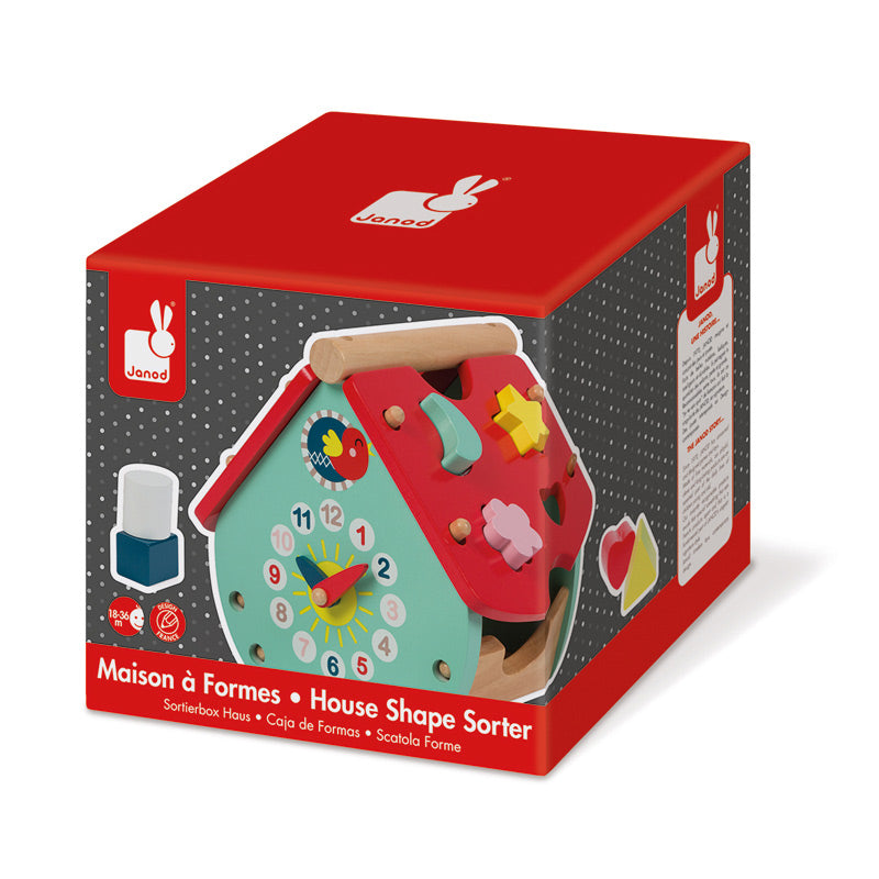 This colourful shape sorter wooden house with clock dial is ideal for learning colours and shapes and introducing time.