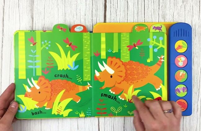 Baby's will discover different dinosaurs which stomp through the colourful pages of this book. Press the buttons to hear a noisy hungry diplodocus, squeaky dinosaur babies. a roaring T.rex as well as other dinosaurs.