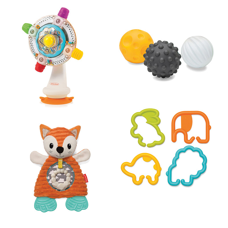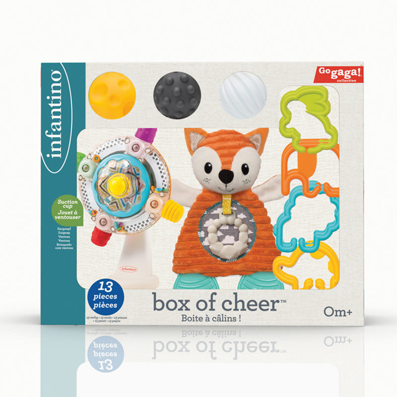 Babies will go gaga for this adorable gift set. This box set features an adorable soft cuddly fox teether, teethable sensory balls, multi-coloured highchair toy and cute animal-shaped teethable links. Bright colours and interesting textures make this Box of Cheer even more fun! Perfect for sensory exploration and tactile development. Made from BPA-free materials.