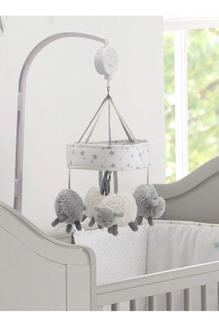 This enchanting Mobile adds a beautiful finishing touch to a Counting Sheep themed nursery. Featuring four soft; sleepy sheep and a farm gate; this soothing mobile plays ‘Twinkle Twinkle Little Star’ and rotates gently; to soothe baby to sleep.