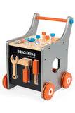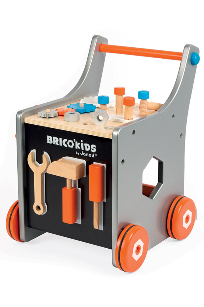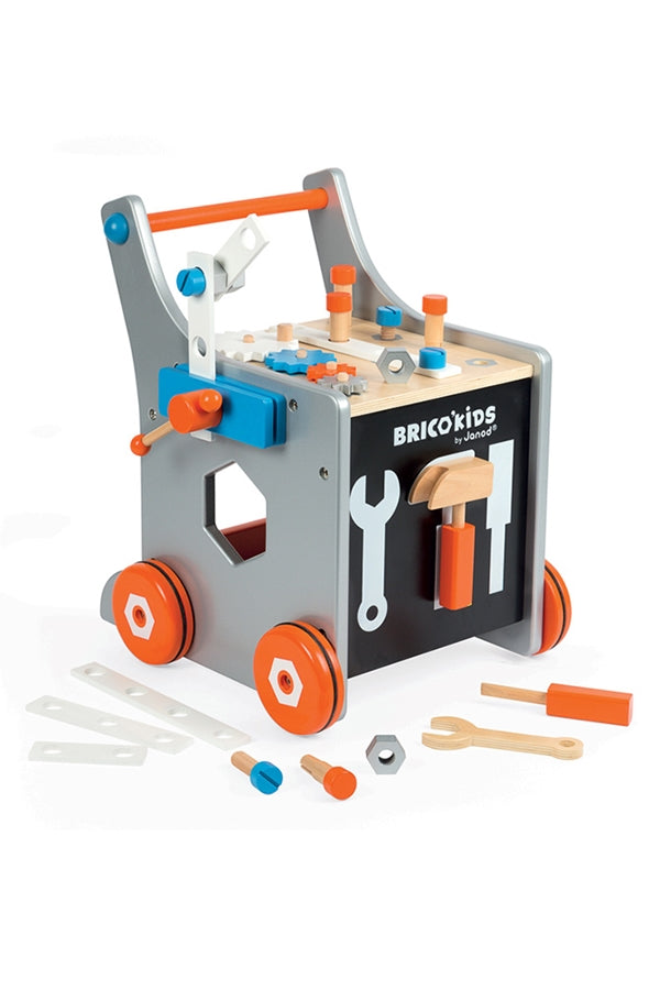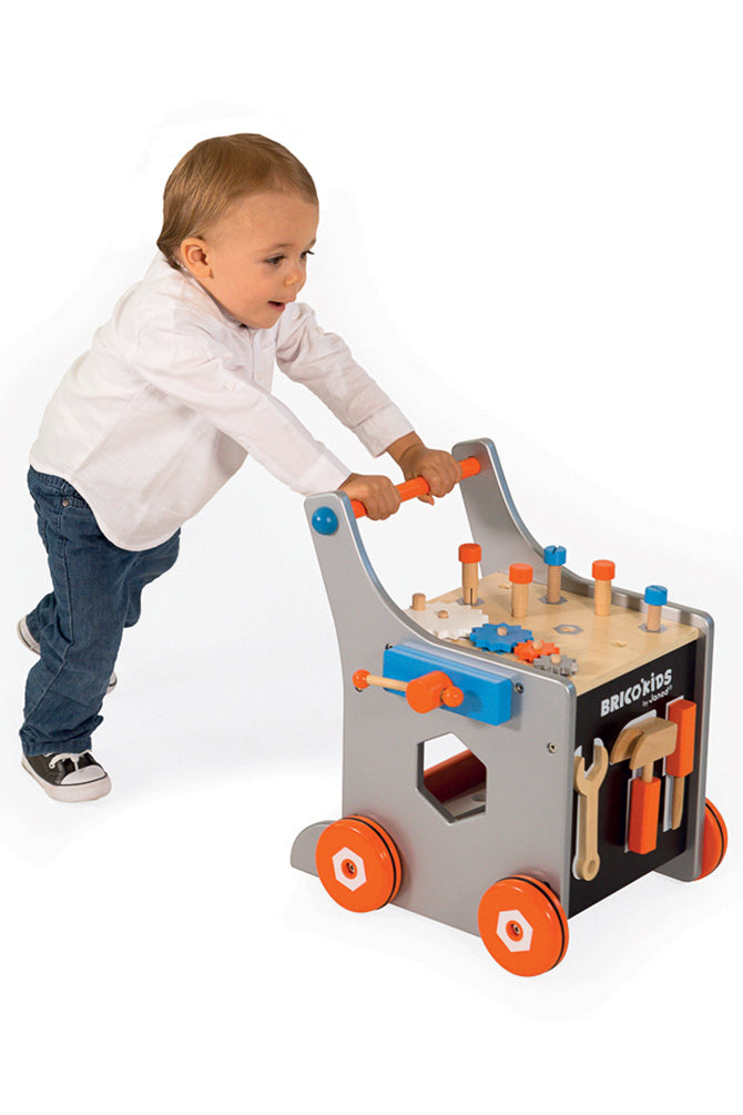 This wooden stroller toy with multiple activities will encourage standing; walking; identification of the included accessories and engage motor and construction skill development as they use them.