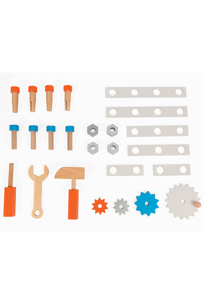 - Includes hammer; screwdriver; wrench; 1 vice; 4 turning gears; 4 nails; 4 screws; 4 bolts; 2 planks with 2 holes; 2 planks with 3 holes; 2 planks with 4 holes