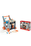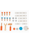 The activity trolley come with 3 magnetic tools of a hammer; screwdriver and wrench as well as 1 vice; 4 turning gears and 18 accessories which include 4 nails; 4 screws; 4 bolts; 2 planks with 2 holes; 2 planks with 3 holes; 2 planks with 4 holes.