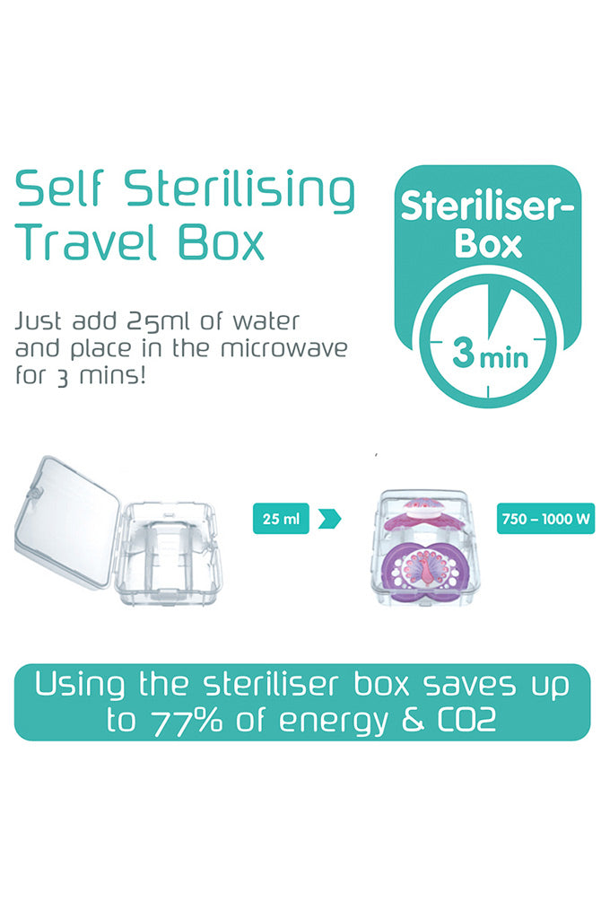 - Self Sterilising travel box makes it easy to clean on the go in 3mins for up to 48hrs