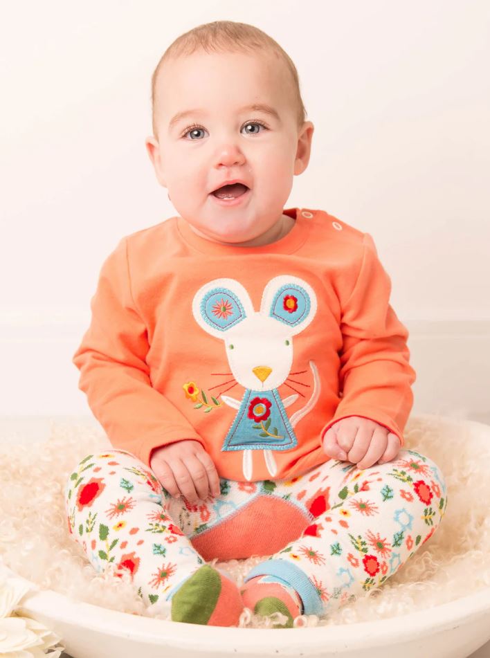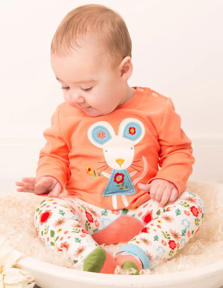 Featured in a coral background with applique and embroidered details, she's a very sweet pipsqueak.