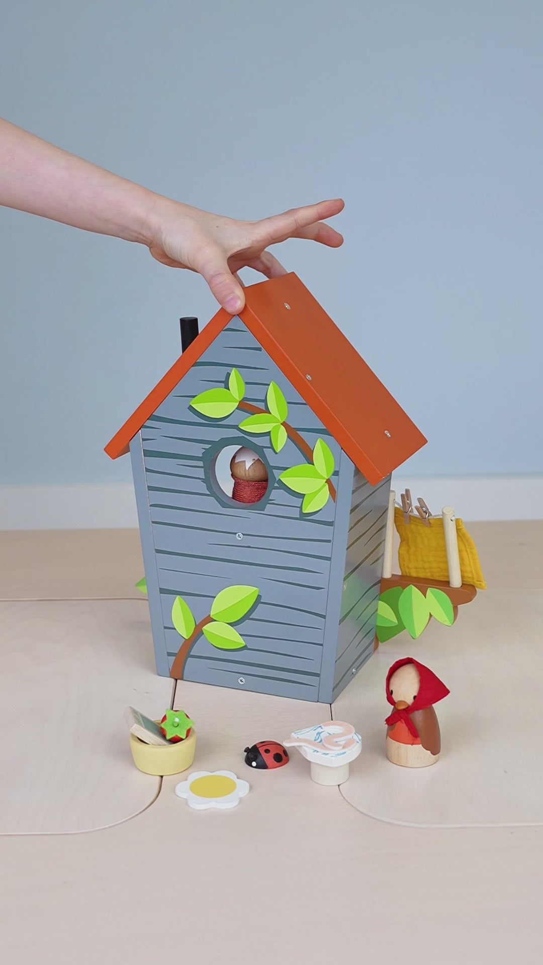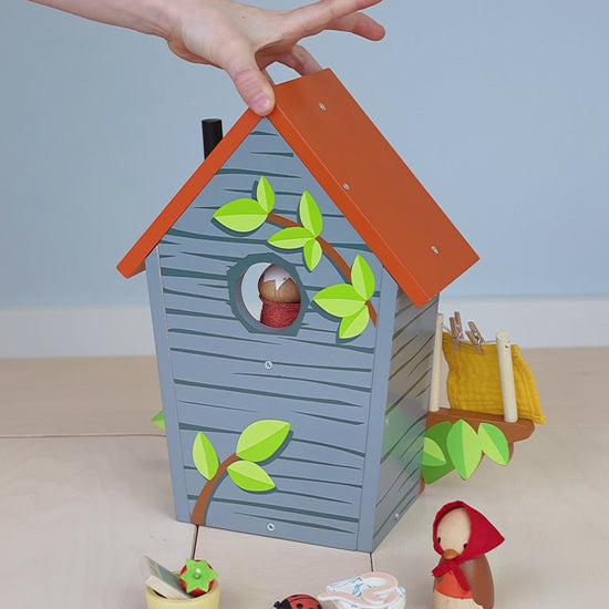 Meet Robin and his growing family! Mother Ruby and baby Rosy who has just hatched out, are eagerly watching the egg upstairs! Ruby is busy washing the sheets and hanging them on the line, while preparing a meal of 2 juicy worms. A fold-out printed backdrop completes the scene and encourages more storytelling! Good for imaginative play. Good for storytelling.