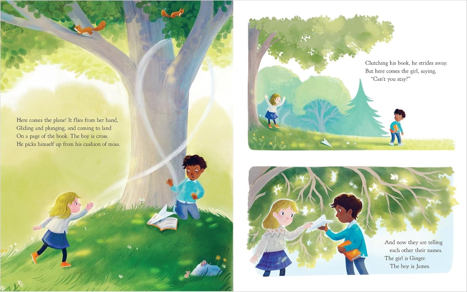 Two children meet under a tall tree. James has a book. Ginger has a paper plane.