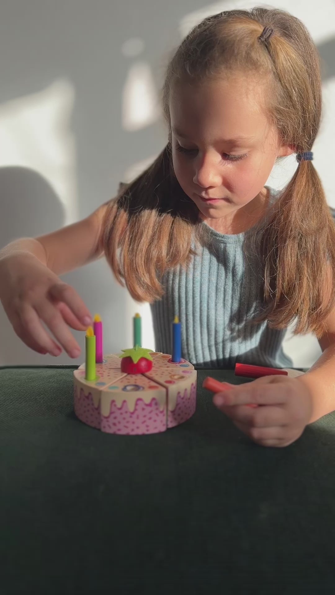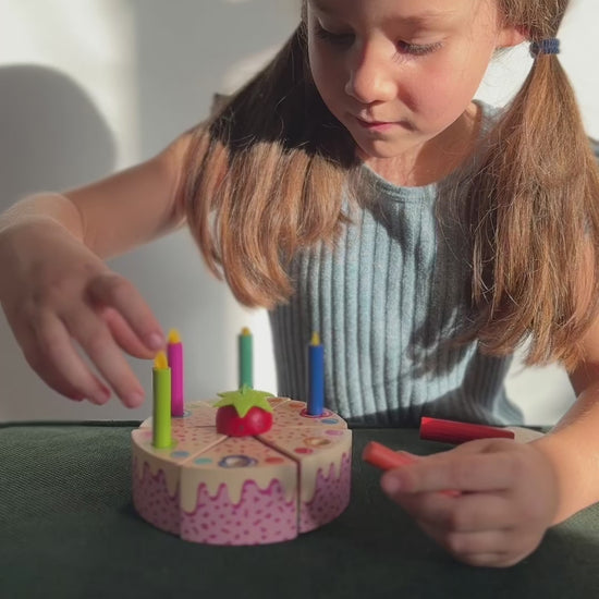 The cake can be 'cut' with a wooden cake slice into 6 pieces to reveal 4 bands of colour on the inside. Patches of velcro allow the 6 cake slices to be reattached once again. 6 removable and different coloured candles complete this set.