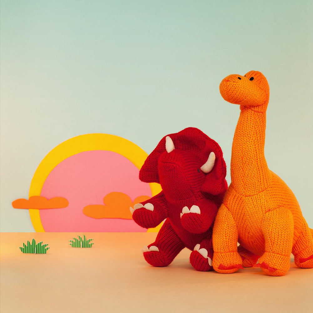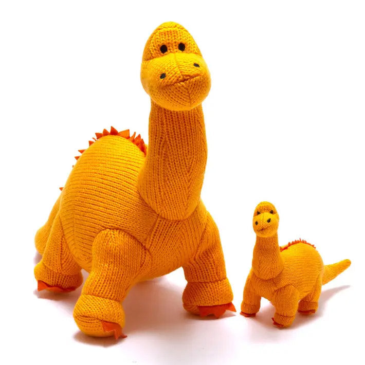 There is definitely something very charming about our small orange diplodocus rattle. It is also very practical as it is machine washable! A popular knitted dinosaur soft toy rattle for babies and toddlers.