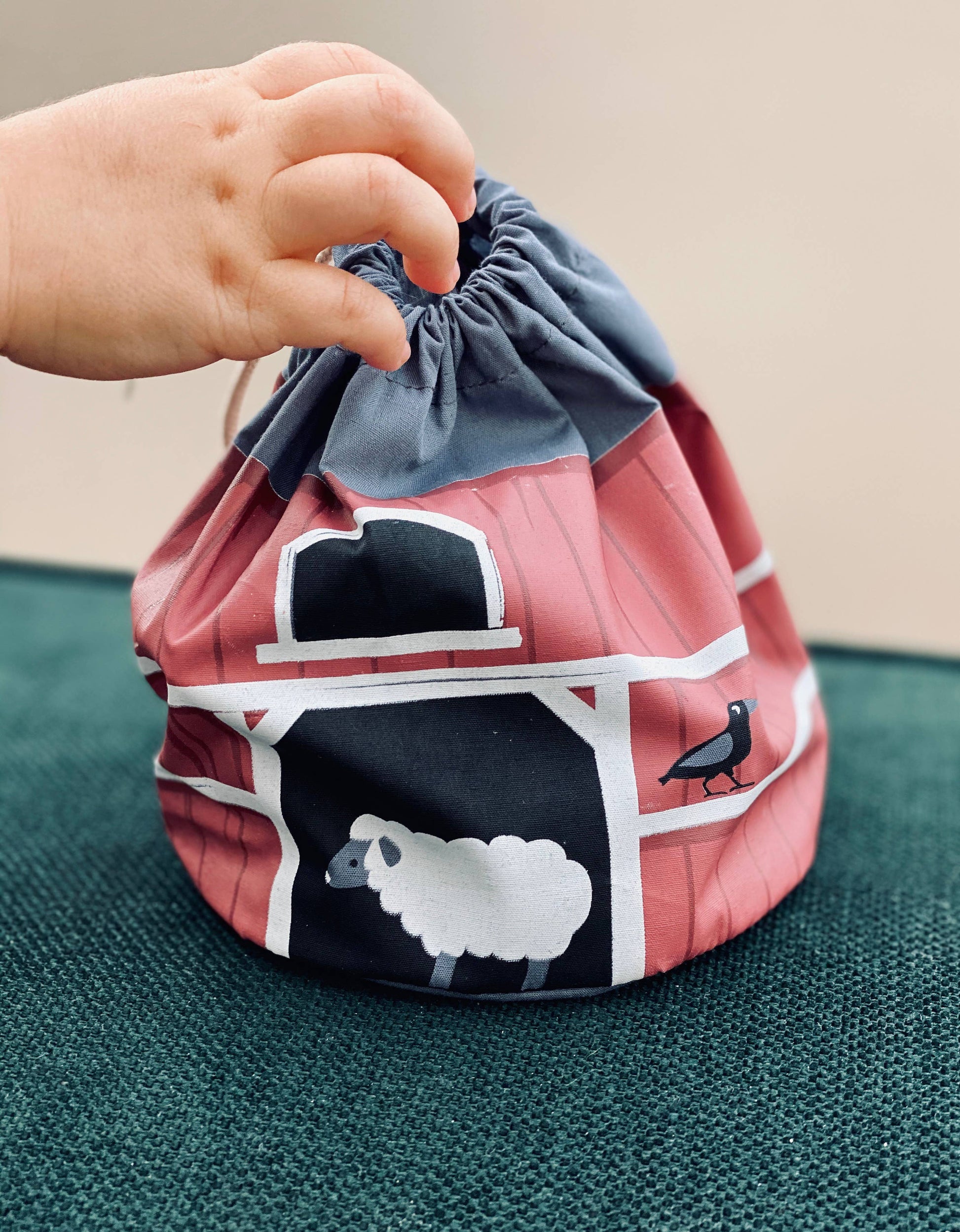 Completely Plastic Free, this wooden toy animal stacker set by Tender Leaf Toys includes a pig, cow, bull, chick, goose, wheelbarrow, and a hay bale, as well as other farmyard animals. All comes in a printed drawstring bag.
