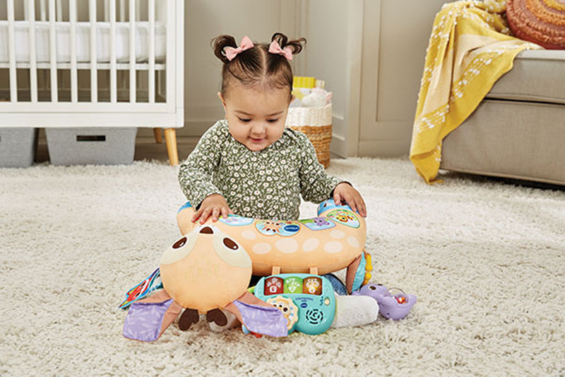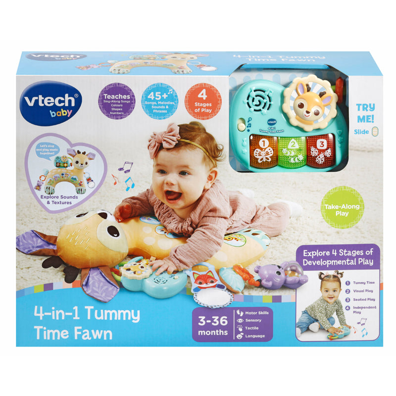Introducing the 4-in-1 Tummy Time Fawn by VTech®! This soft, cuddly tummy time pillow includes 4 ways to play.