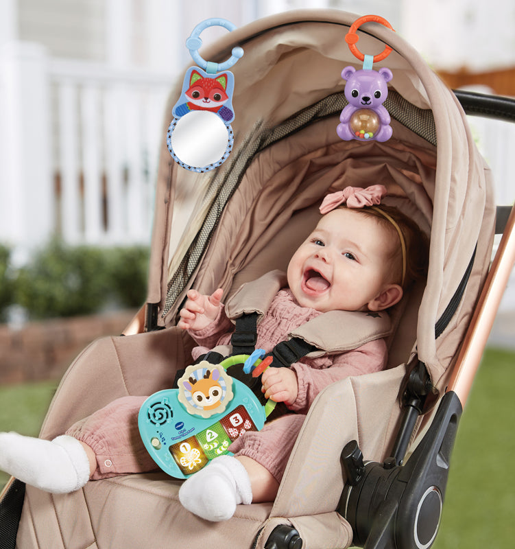 As your little one grows and develops the detachable hippo rattle, self-discovery fox mirror and electronic piano keep little ones engaged. Light up piano keys on the removable piano introduce animals and play piano notes, sounds, sing-along songs and melodies.