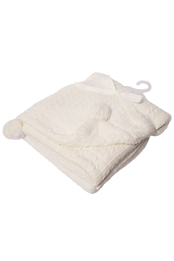 - We love this snuggly White Cable Knit Wrap with Poms and Sherpa